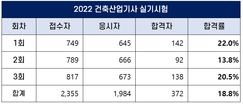 2022년 건축기사 합격률 (1회, 2회, 4회 필기 및 실기 합격률)