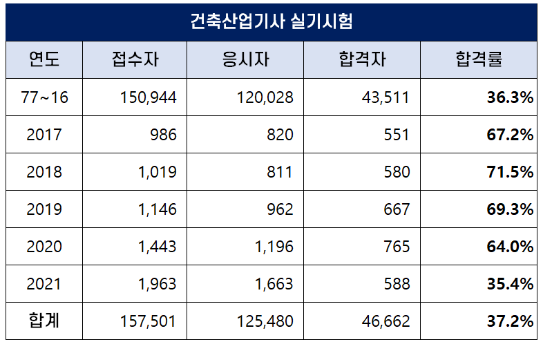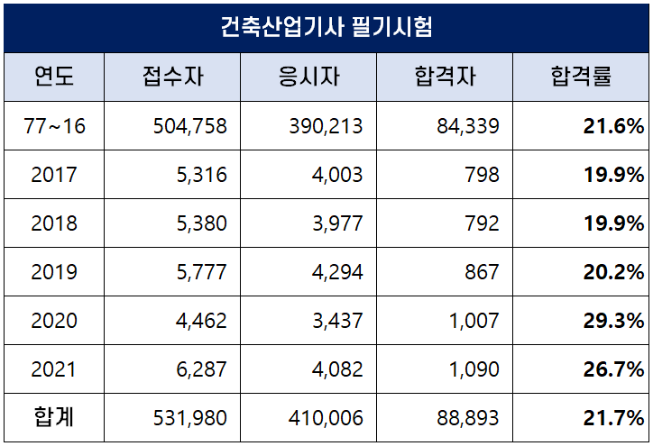 아래 표는 건축산업기사 자격시험이 처음 시행된 1977년부터 2021년까지 역대 건축산업기사 필기시험 접수자, 응시자, 합격자 및 합격률 현황인데요. 평균 필기 합격률은 21.7%입니다.
