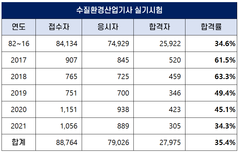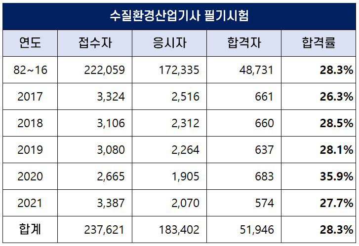 아래 표는 수질환경산업기사 자격시험이 처음 시행된 1982년부터 2021년까지 역대 수질환경산업기사 필기시험 접수자, 응시자, 합격자 및 합격률 현황인데요. 평균 필기 합격률은 28.3%이나 2020년에는 35.9%의 높은 합격률을 기록하기도 했습니다.