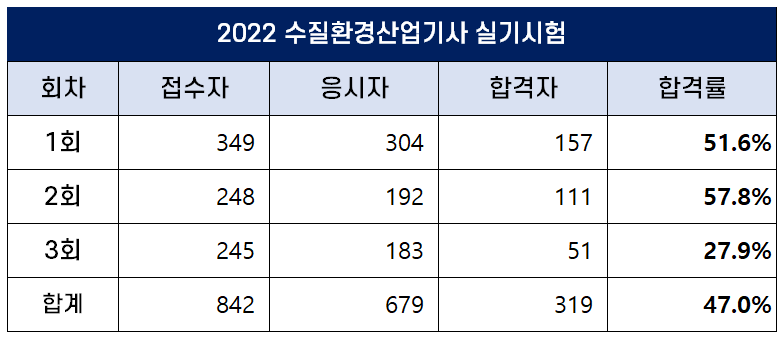 2022년 3회 수질환경산업기사 실기 합격률은 27.9%이고, 2022년 평균 합격률은 47.0%입니다.