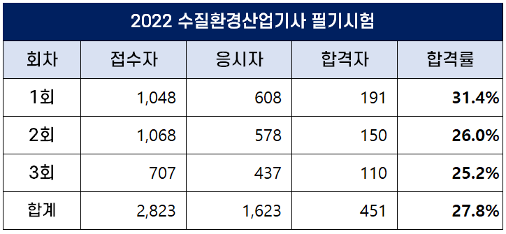 2022년 수질환경기사 합격률 (1회, 2회, 3회 필기 및 실기)