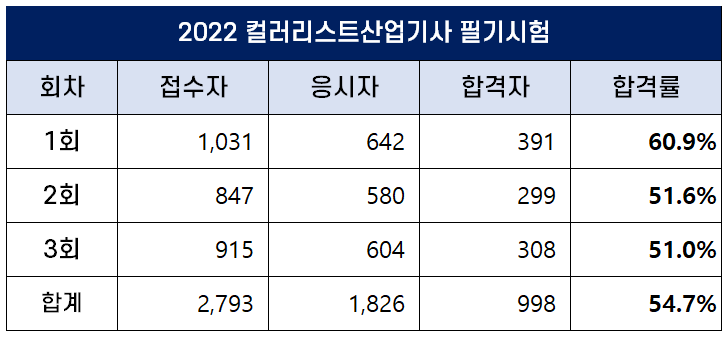 아래 표에서 보는 것처럼 2022년 컬러리스트산업기사 필기시험에는 총 2,793명이 원서접수를 했는데요. 이 중 1,826명이 필기시험에 응시했고 998명이 합격을 해 평균 합격률은 54.7%입니다.
