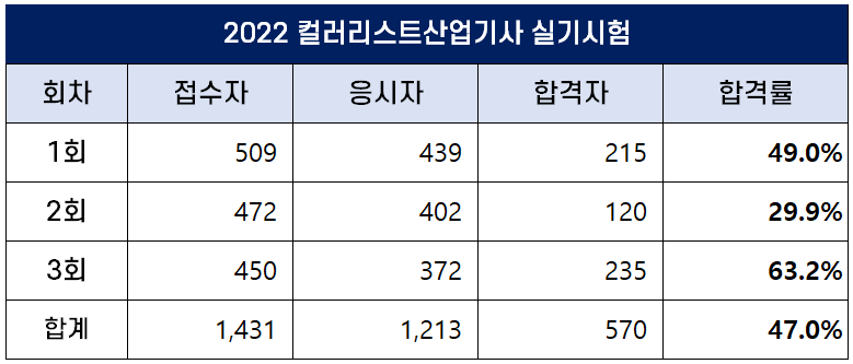 2022년 컬러리스트기사 합격률 (1회, 2회, 3회 필기 및 실기)