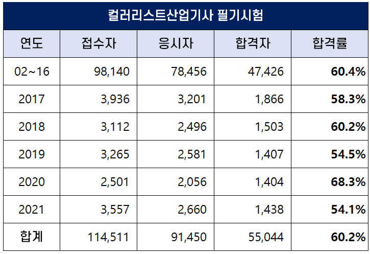 아래 표는 컬러리스트산업기사 자격시험이 처음 시행된 2002년부터 2021년까지 역대 컬러리스트산업기사 필기시험 접수자, 응시자, 합격자 및 합격률 현황인데요. 평균 필기 합격률은 60.2%이나 2020년에는 68.3%의 높은 합격률을 기록하기도 했습니다.