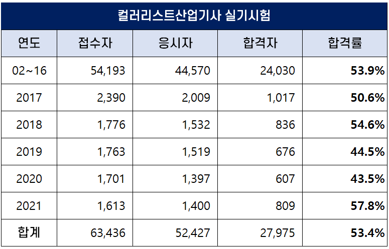 2002년부터 2021년까지 역대 컬러리스트산업기사 실기 평균 합격률은 53.4%인데요. 최근 합격률을 보면 40~50%대의 합격률을 유지하고 있습니다.