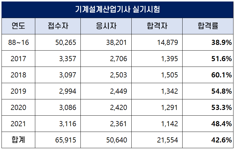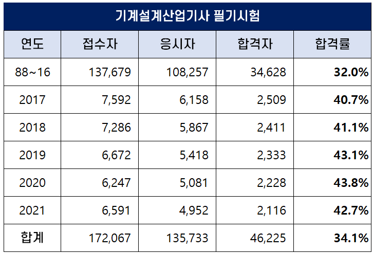 아래 표는 기계설계산업기사 자격시험이 처음 시행된 1988년부터 2021년까지 역대 기계설계산업기사 필기시험 접수자, 응시자, 합격자 및 합격률 현황인데요. 평균 필기 합격률은 34.1%이나 최근 합격률이 높아져 2020년에는 43.8%의 높은 합격률을 기록하기도 했습니다.