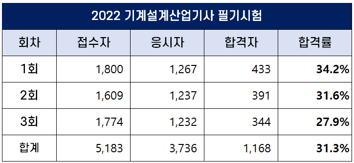 아래 표에서 보는 것처럼 2022년 기계설계산업기사 필기시험에는 총 5,183명이 원서접수를 했는데요. 이 중 3,736명이 필기시험에 응시했고 1,168명이 합격을 해 평균 합격률은 31.3%입니다.
