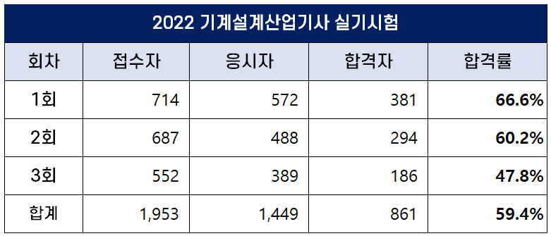 2022년 3회 기계설계산업기사 실기 합격률은 47.8%이고, 2022년 평균 합격률은 59.4%입니다.