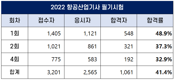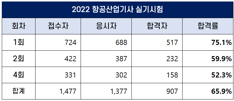 이번 포스팅에서는 2022년에 시행된 1회, 2회, 4회 항공산업기사 필기 및 실기 시험 원서접수인원, 응시인원, 합격인원 및 합격률에 대해 정리했습니다.