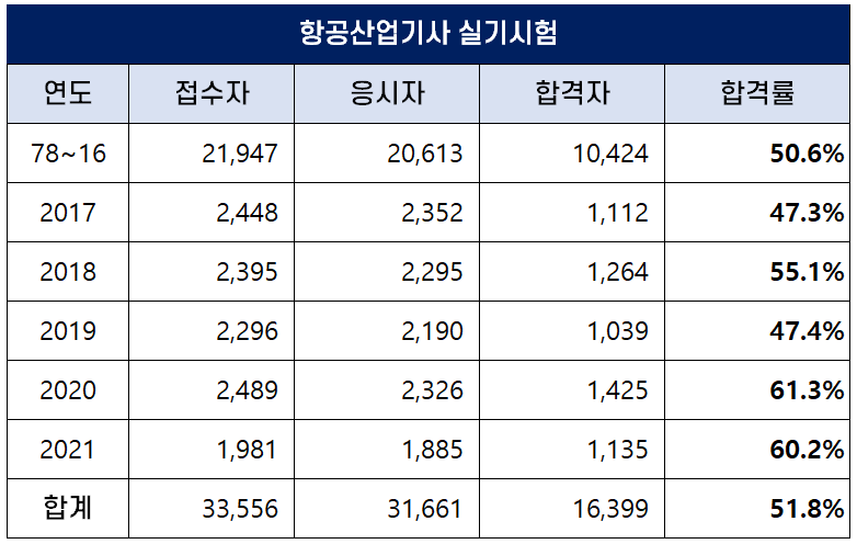 1978년부터 2021년까지 역대 항공산업기사 실기 평균 합격률은 51.8%인데요. 최근 합격률이 높아져 2020년에는 61.3%의 높은 합격률을 기록하기도 했습니다.