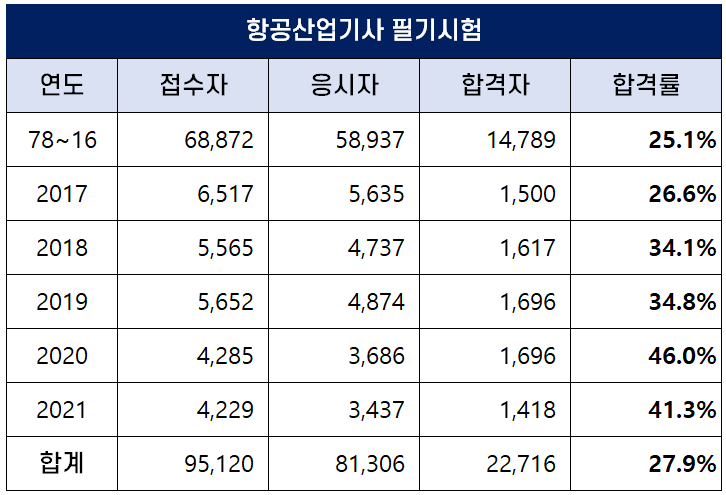 아래표는 항공산업기사가 시행된 1978년부터 2021년까지 역대 항공산업기사 필기시험 합격률인데요. 평균 합격률은 27.9%이나 최근 합격률이 높아져 2020년에는 46.0.3%, 2021년에는 41.3%의 합격률을 기록했습니다.