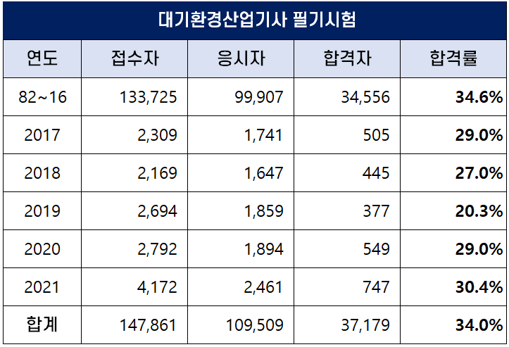 아래표는 대기환경산업기사가 시행된 1982년부터 2021년까지 역대 대기환경산업기사 필기시험 합격률인데요. 평균 합격률은 34.0%입니다.