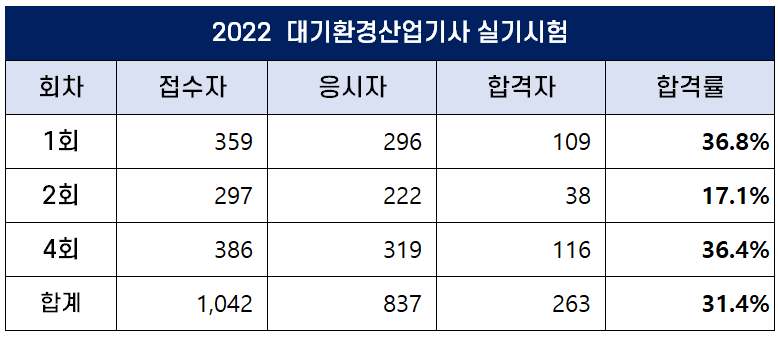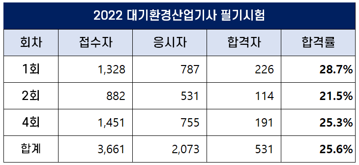 이번 포스팅에서는 2022년에 시행된 1회, 2회, 4회 대기환경산업기사 필기 및 실기 시험 원서접수인원, 응시인원, 합격인원 및 합격률에 대해 정리했습니다.