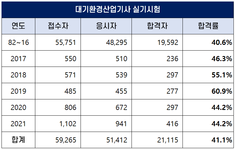 1982년부터 2021년까지 역대 대기환경산업기사 실기 평균 합격률은 41.1%인데요. 2019년에는 60.9%의 높은 합격률을 기록하기도 했습니다.