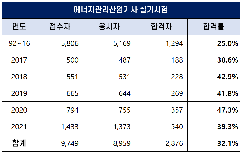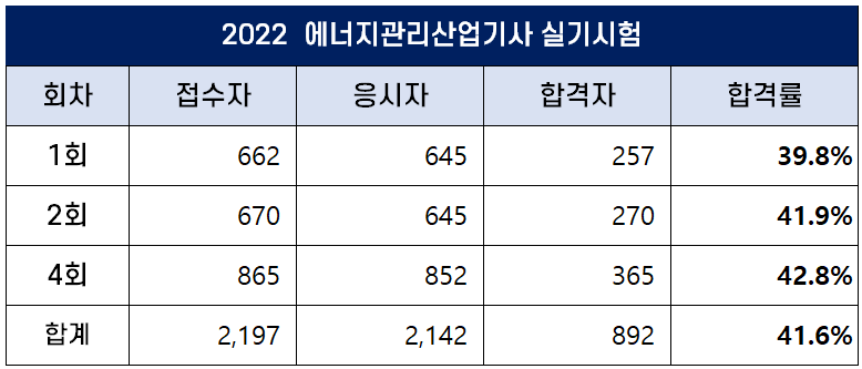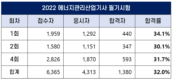 2022년 에너지관리기사 합격률 (1회, 2회, 4회 필기 및 실기)