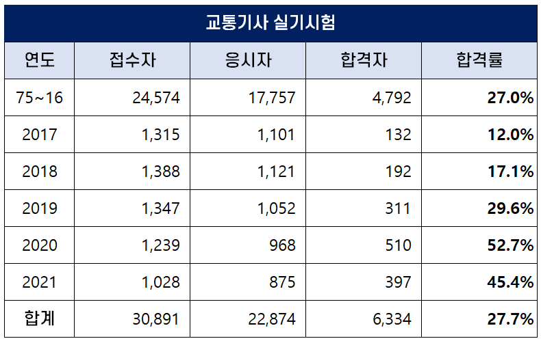 1975년부터 2021년까지 역대 교통기사 실기 평균 합격률은 27.7%인데요. 최근 합격률이 높아져 2020년에는 52.7%의 높은 합격률을 기록하기도 했습니다.