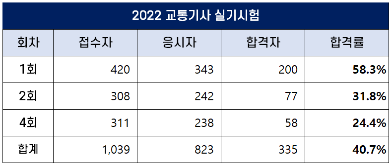이번 포스팅에서는 2022년에 시행된 1회, 2회, 4회 교통기사 필기 및 실기 시험 원서접수인원, 응시인원, 합격인원 및 합격률에 대해 정리했습니다.