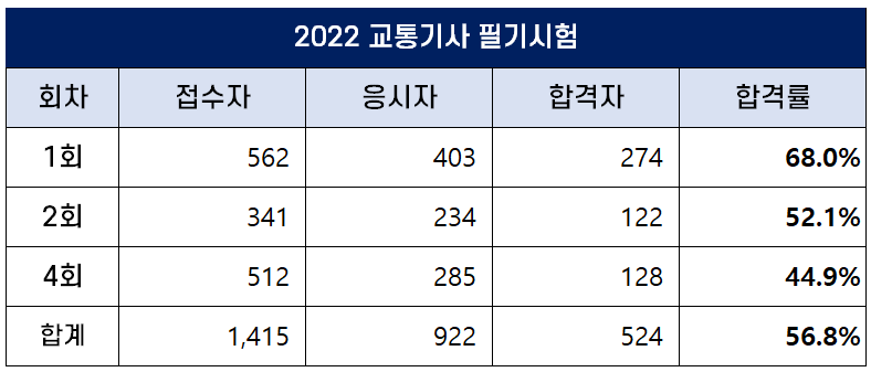 2022년 4회 교통기사 필기시험 합격률은 44.9%로 2022년 시행된 시험 중 합격률이 가장 낮았습니다.