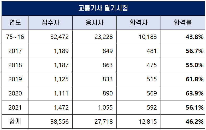 아래 표는 교통기사 자격시험이 처음 시행된 1975년부터 2021년까지 역대 교통기사 필기시험 합격률인데요. 평균 합격률은 46.2%이나 2020년에는 6..9%의 높은 합격률을 기록했습니다.