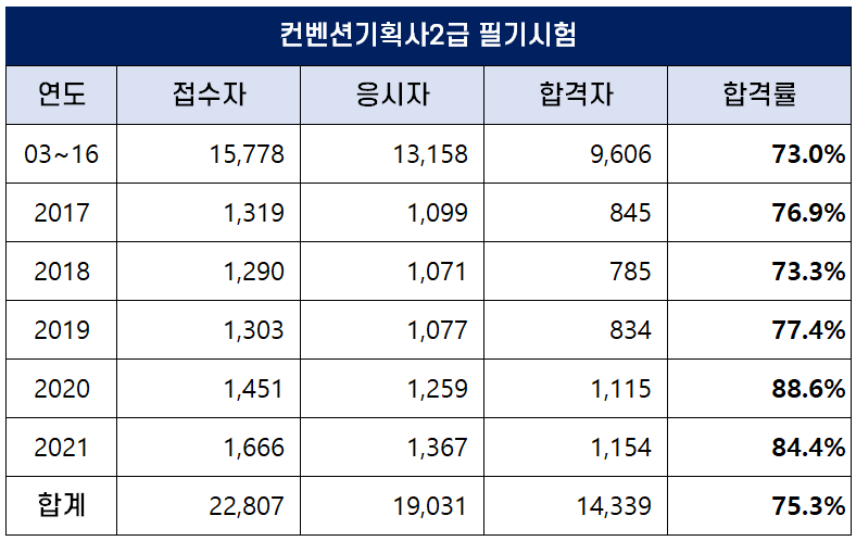 아래 표는 컨벤션기획사 2급 자격시험이 처음 시행된 2003년부터 2021년까지 접수자, 응시자, 합격자 및 합격률 현황입니다. 역대 컨벤션기획사 2급 필기 평균 합격률은 75.3%인데 2020년에는 88.6%의 높은 합격률을 기록하기도 했습니다.