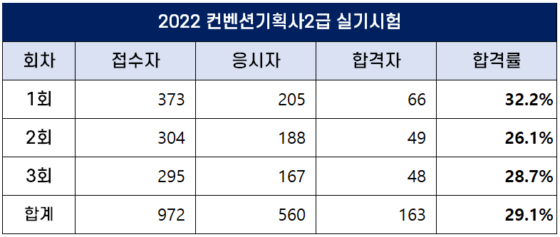 이번 포스팅에서는 2022년에 시행된 1회, 2회, 3회 컨벤션기획사 2급 필기 및 실기 시험 원서접수인원, 응시인원, 합격인원 및 합격률에 대해 정리했습니다.