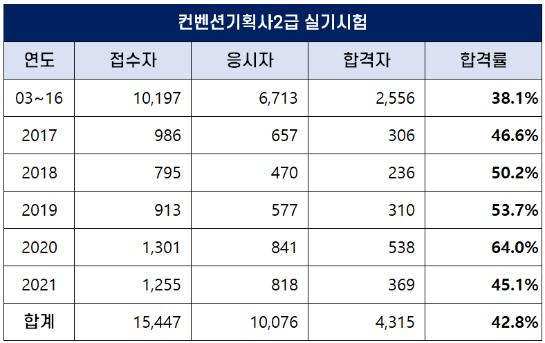 2003년부터 2021년까지 컨벤션기획사 2급 실기 평균 합격률은 42.8%인데요. 최근 합격률이 높아져 2020년에는 64.0%의 합격률을 기록했습니다.