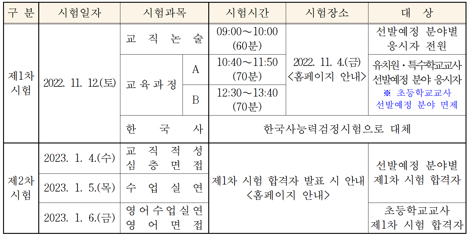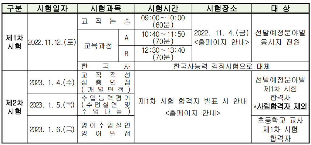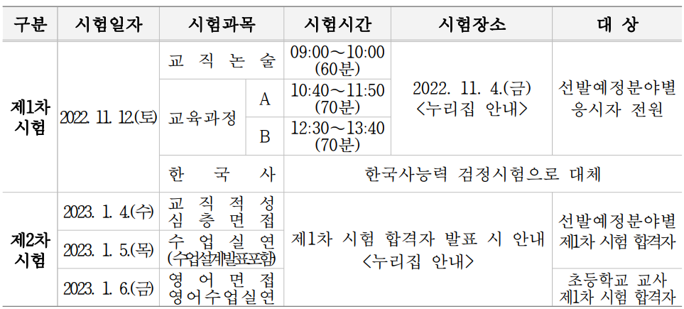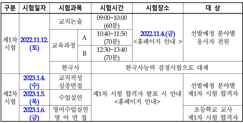 원서접수기간 및 1차 시험일은 전국 17개 시·도 교육청이 동일하지만 2차 시험 및 기타 세부일정은 지역마다 조금씩 다릅니다.