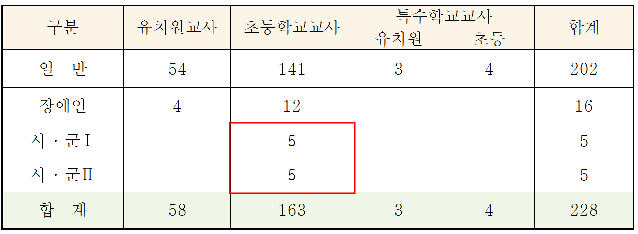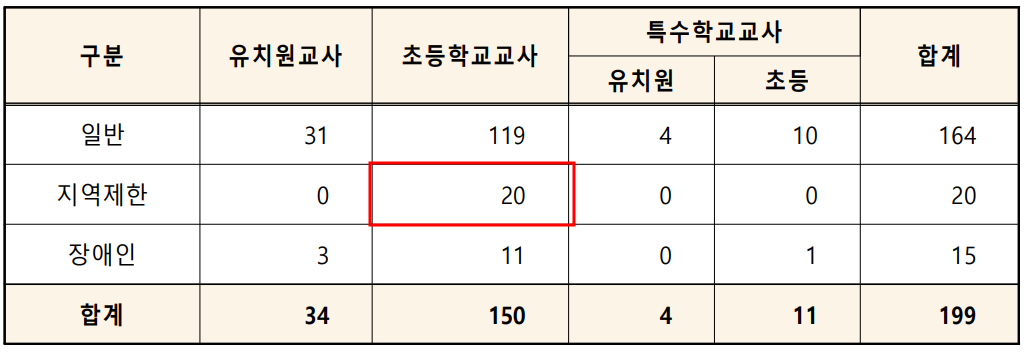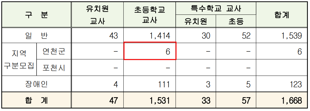경기도, 충청남도, 전라남도 교육청의 경우에는 일반모집과 장애인 구분 모집 외에 아래와 같이 지역구분 모집으로 초등교사를 선발하는데요. 경기도는 6명, 충청남도는 20명, 전라남도는 10명을 선발합니다.