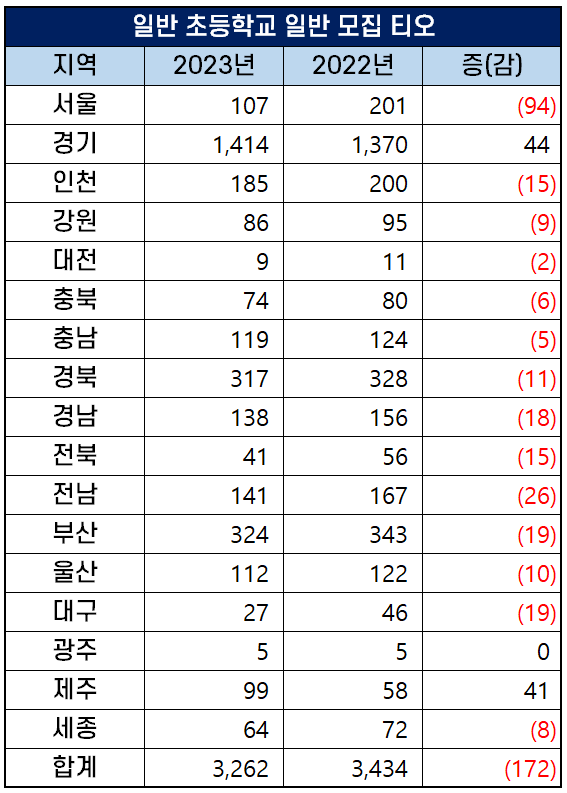 2023년 초등 임용 고시 일반모집 티오는 총 3,262명으로 지난해 3,434명보다 172명이 줄었습니다.