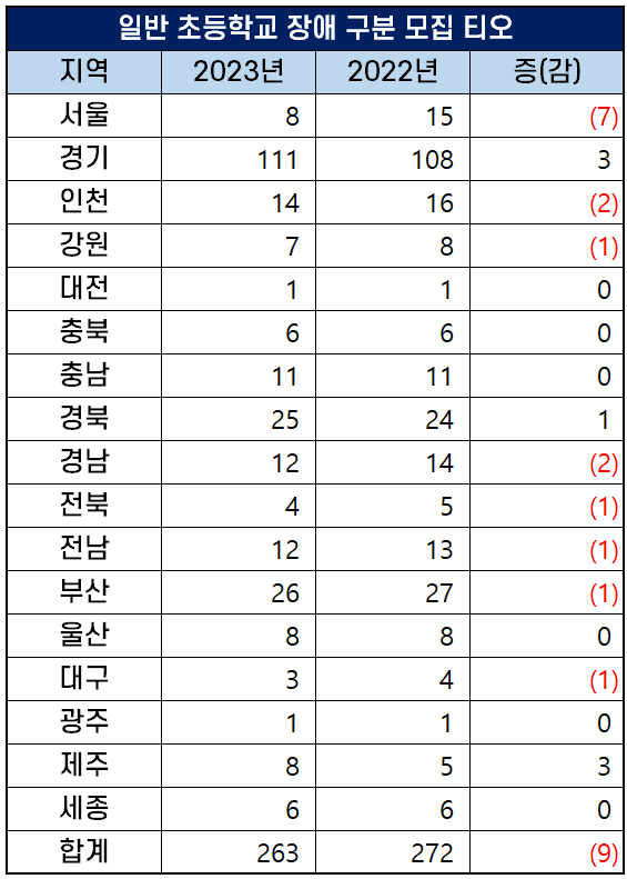 2023년 초등 임용 고시 장애모집 티오는 총 263명으로 지난해 272명보다 9명이 줄었습니다.