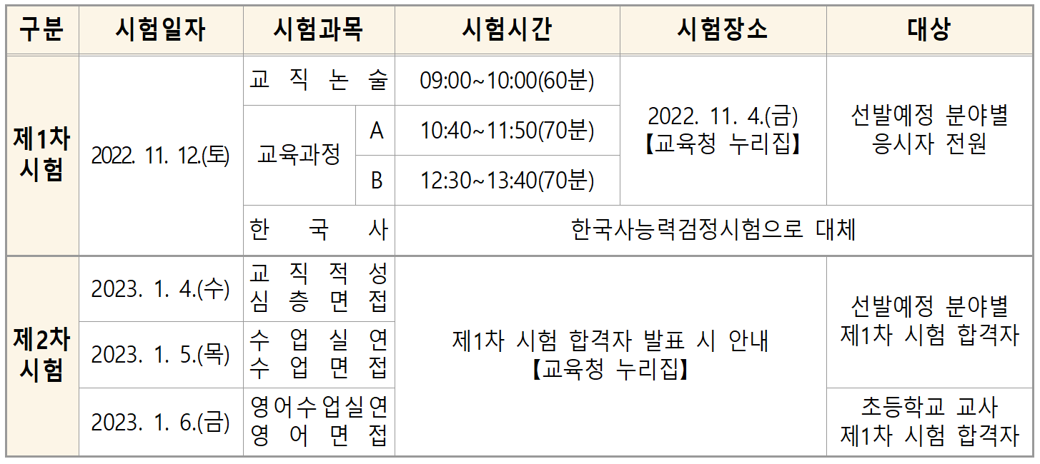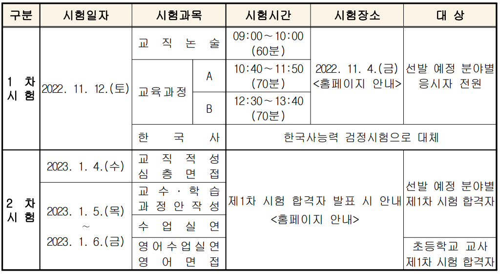 원서접수기간 및 1차 시험일은 전국 17개 시·도 교육청이 동일하지만 2차 시험 및 기타 세부일정은 지역마다 조금씩 다르니 하단에 첨부하는 각 시도교육청 별 세부일정과 공고를 확인하시기 바랍니다.
