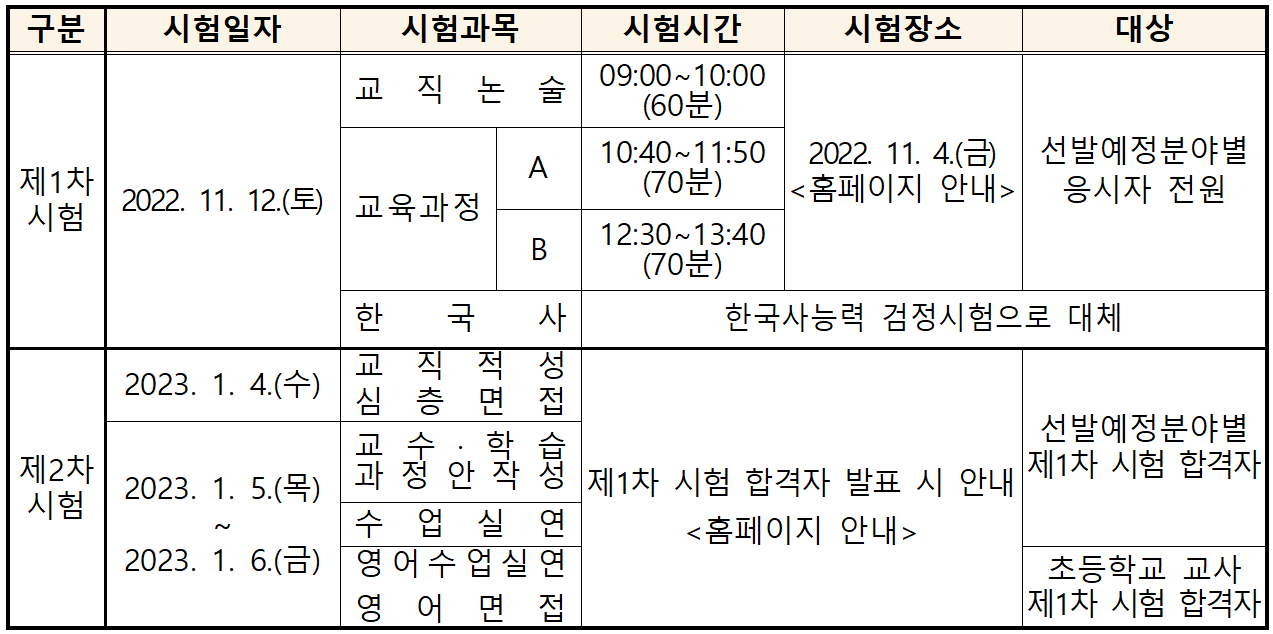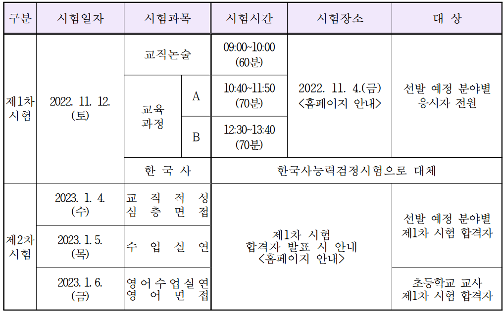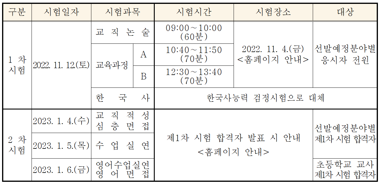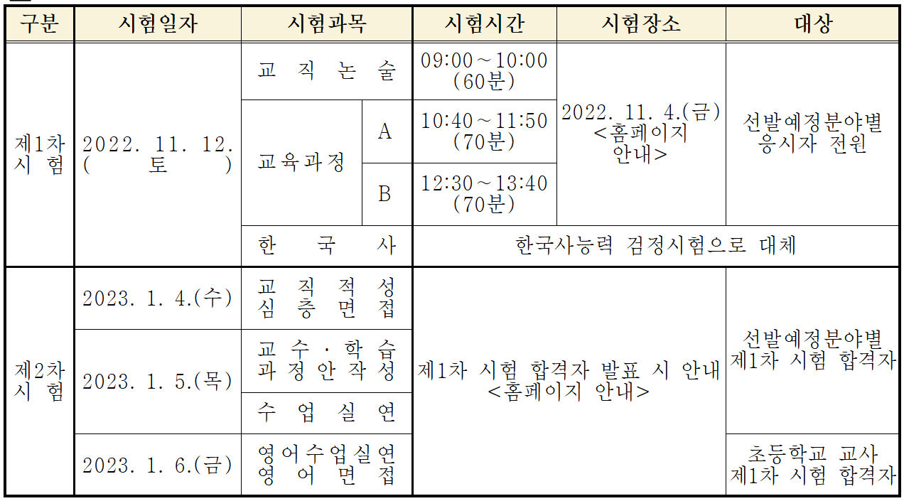 | 2023학년도 초등 임용 고시 일정 (+ 17개 시·도 교육청 시험 시행계획 공고) (0) | 2022.09.14 |