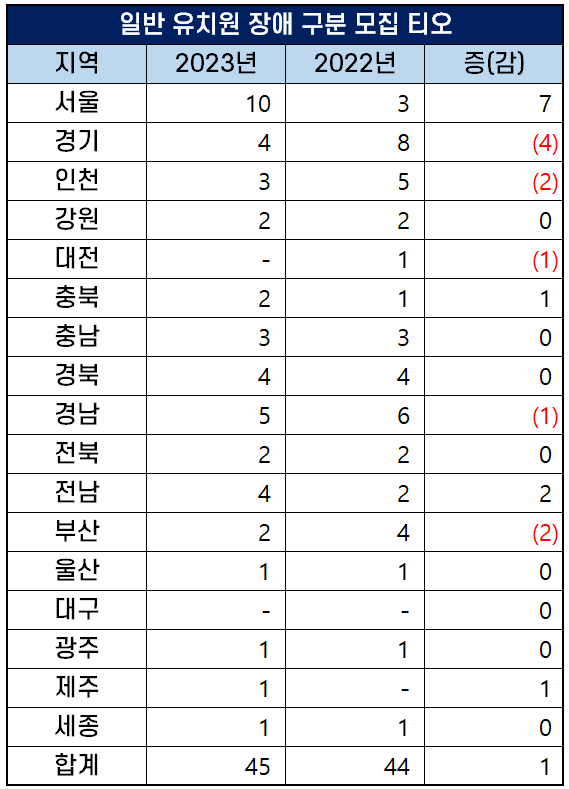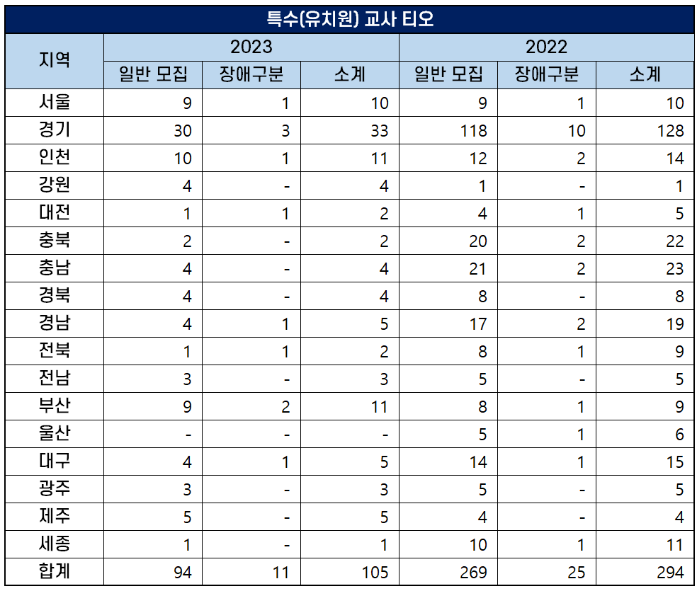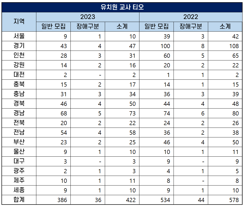 2023년 유치원 임용 고시 장애 구분 모집 티오는 총 45명으로 지난해 44명보다 1명이 줄었습니다.