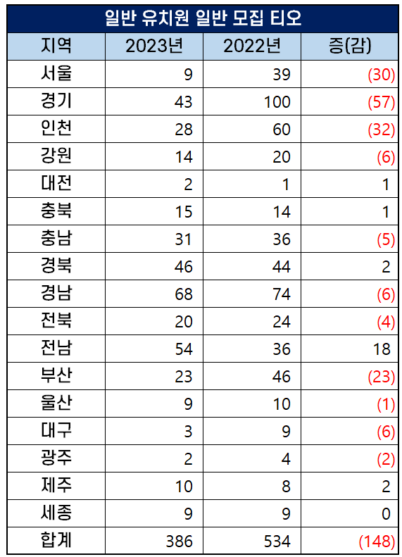 2023년 유치원 임용 고시 일반모집 티오는 총 386명으로 지난해 534명보다 148명이 감소했습니다.