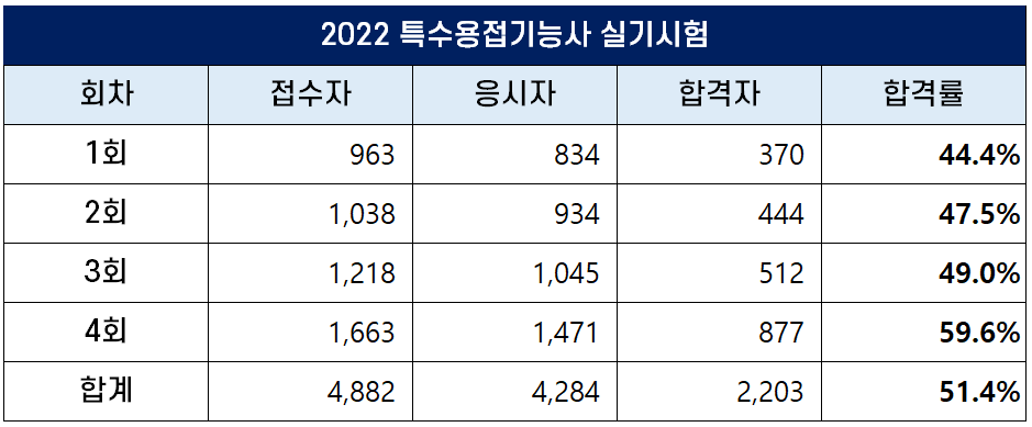 이번 포스팅에서는 2022년에 시행된 1회, 2회, 3회, 4회 특수용접기능사 필기 및 실기 시험 원서접수자, 응시자, 합격자 및 합격률에 대해 정리했습니다.