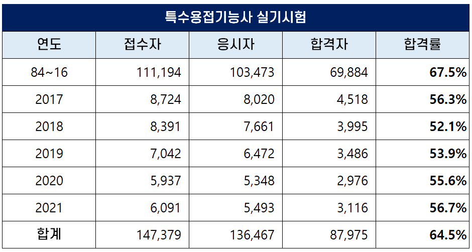 1984년부터 2021년까지 역대 특수용접기능사 실기 평균 합격률은 64.5%인데요. 최근 5년간은 합격률이 낮아져 50%대 합격률을 보이고 있습니다.