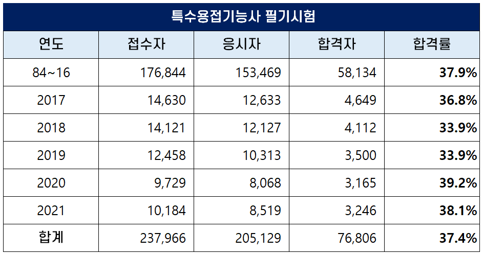 아래 표는특수용접기능사 자격시험이 처음 시행된 1984년부터 2021년까지 역대 특수용접기능사 필기시험 접수자, 응시자, 합격자 및 합격률 현황인데요. 평균 필기 합격률은37.4%입니다.