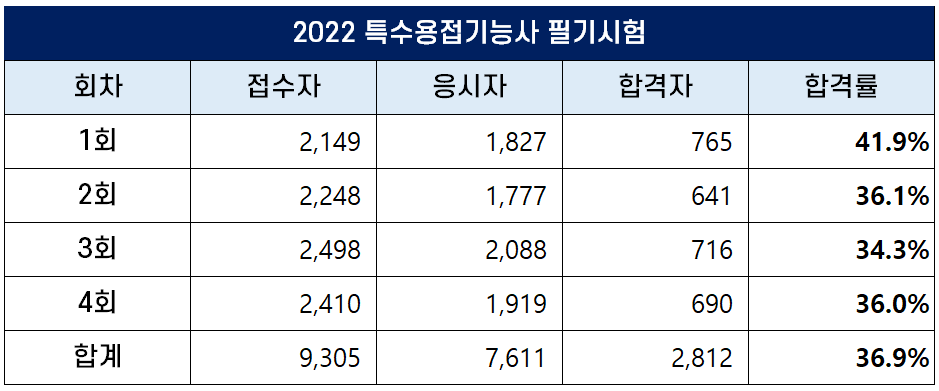 2022년 특수용접기능사 필기시험에는 총 9,305명이 원서접수를 했는데요. 이 중 7,611명이 응시해 2,812명이 합격했고, 합격률은 36.9%입니다.