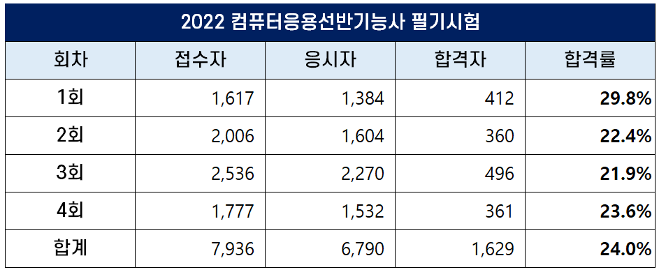 2022년 컴퓨터응용선반기능사 필기시험에는 총 7,936명이 원서접수를 했는데요. 이 중 6,790명이 응시해 1,629명이 합격했고, 합격률은 24.0%입니다.