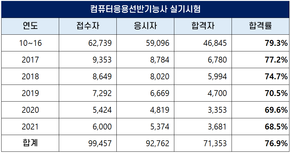 2010년부터 2021년까지 역대 컴퓨터응용선반기능사 실기 평균 합격률은 76.9%인데요. 최근에는 합격률이 낮아져 60%대의 합격률을 보이고 있습니다.