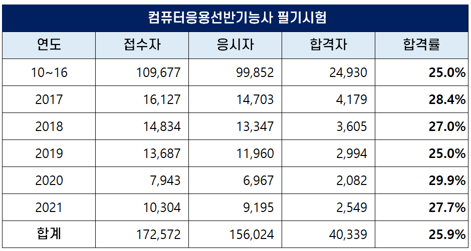 아래 표는 컴퓨터응용선반기능사사 자격시험이 처음 시행된 2010년부터 2021년까지 역대 컴퓨터응용선반기능사 필기시험 접수자, 응시자, 합격자 및 합격률 현황인데요. 평균 필기 합격률은25.9%입니다.
