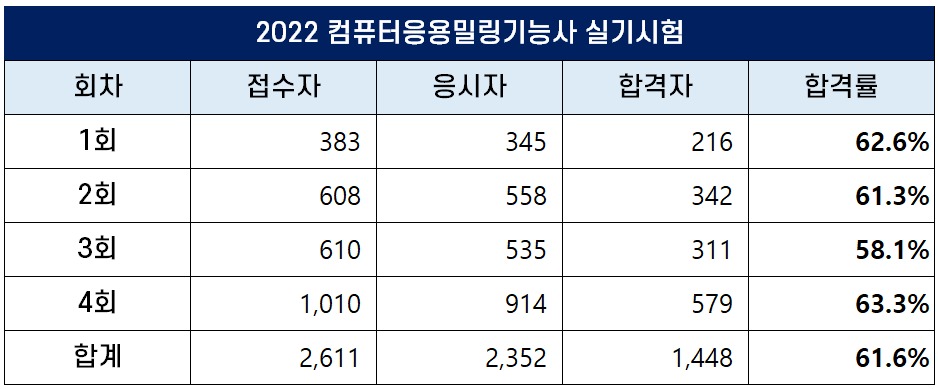 이번 포스팅에서는 2022년에 시행된 1회, 2회, 3회, 4회 컴퓨터응용밀링기능사 필기 및 실기 시험 원서접수자, 응시자, 합격자 및 합격률에 대해 정리했습니다.