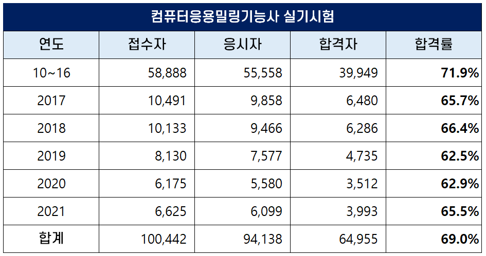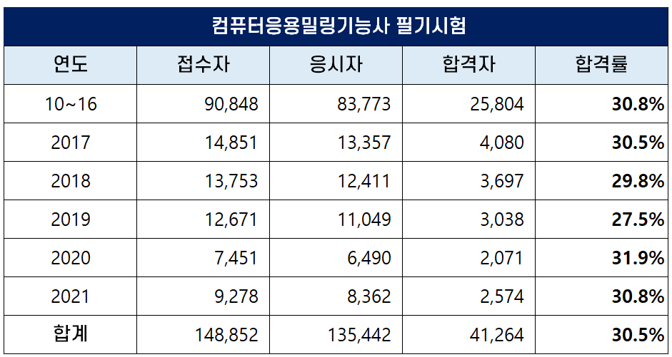 아래 표는 컴퓨터응용밀링기능사 자격시험이 처음 시행된 2010년부터 2021년까지 역대 컴퓨터응용밀링기능사 필기시험 접수자, 응시자, 합격자 및 합격률 현황인데요. 평균 필기 합격률은 30.5%이입니다.