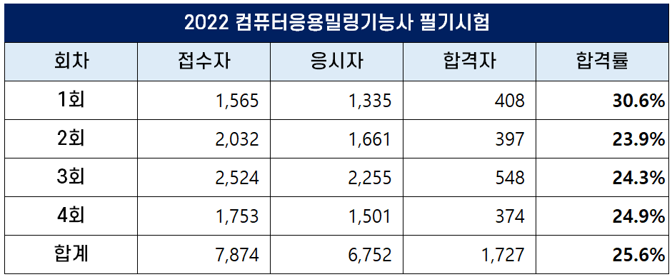 2022년 컴퓨터응용밀링기능사 필기시험에는 총 7,874명이 원서접수를 했는데요. 이 중 6,752명이 응시해 1,727명이 합격했고 합격률은 25.6%입니다.