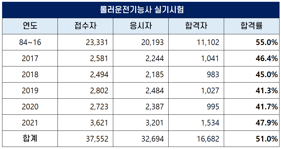 1984년부터 2021년까지 역대 롤러운전기능사 실기 평균 합격률은 51.0%인데요. 최근 5년간은 합격률이 낮아져 40%대의 합격률을 보이고 있습니다.