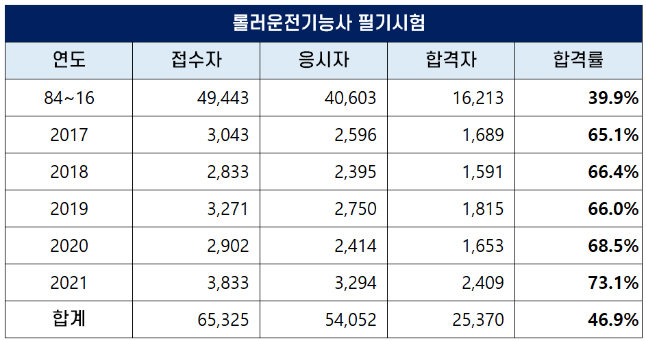 아래 표는 롤러운전기능사 자격시험이 처음 시행된 1984년부터 2021년까지 역대 롤러운전기능사 필기시험 접수자, 응시자, 합격자 및 합격률 현황인데요. 평균 필기 합격률은 46.9%이나 2021년에는 73.1%의 높은 합격률을 기록하기도 했습니다.