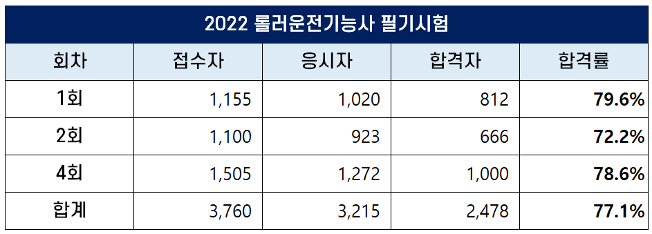 2022년 롤러운전기능사 필기시험에는 총 3,760명이 원서접수를 했는데요. 이 중 3,215명이 필기시험에 응시해 2,478명이 합격했고 77.1%의 합격률을 기록했습니다.