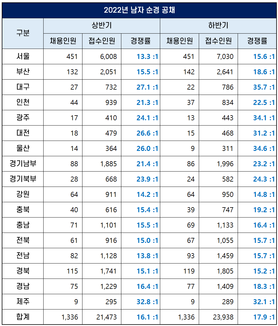17개 시도 지방경찰청에서 채용하는 2022년 1차 상반기 및 2차 하반기 남자 순경 공채 인원과 경쟁률은 아래 표로 정리했습니다.