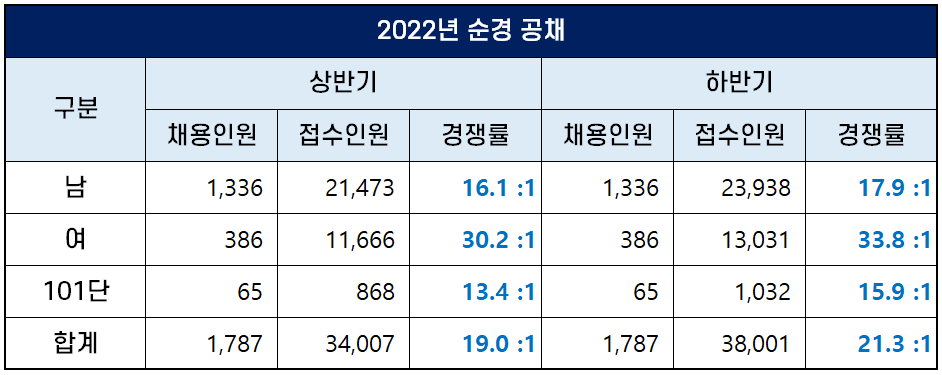 2022년 상반기와 하반기에 순경 공채로 채용하는 경찰공무원 인원은 2021년보다 적었는데요. 원서접수인원도 전년대비 감소했지만 채용인원 감소폭이 더 커 경쟁률은 전년대비 상승했습니다.