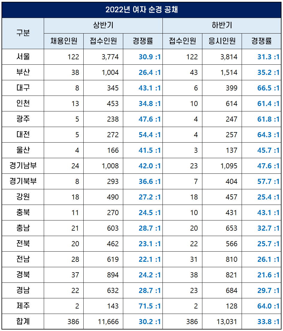 2022년 상반기 여자 순경 공채에서는 2명으로 가장 적은 인원을 채용한 제주 경찰청의 경쟁률이 71.5대 1로 가장 높았고, 28명을 선발한 전라남도 경찰청의 경쟁률이 22.1대 1로 가장 낮았습니다.